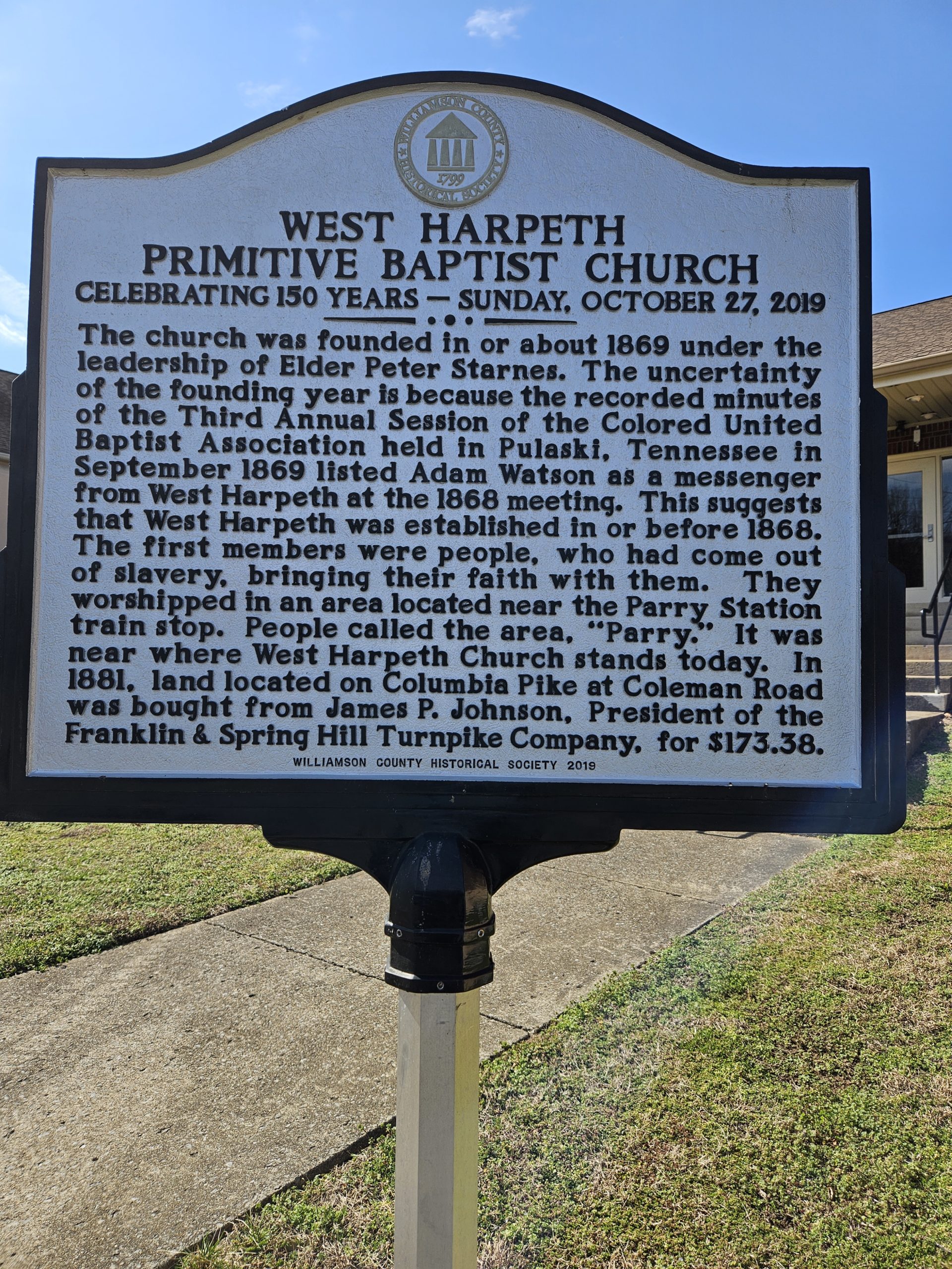 On March 14, 1881, under Elder Starnes’ leadership, land located at 4141 Columbia Pike was purchased from James Johnson for the sum of $173.38 and the first worship facility was erected. During the dedication service, they named the church building West Harpeth Primitive Baptist Church because of its location—near Old West Harpeth Lane.